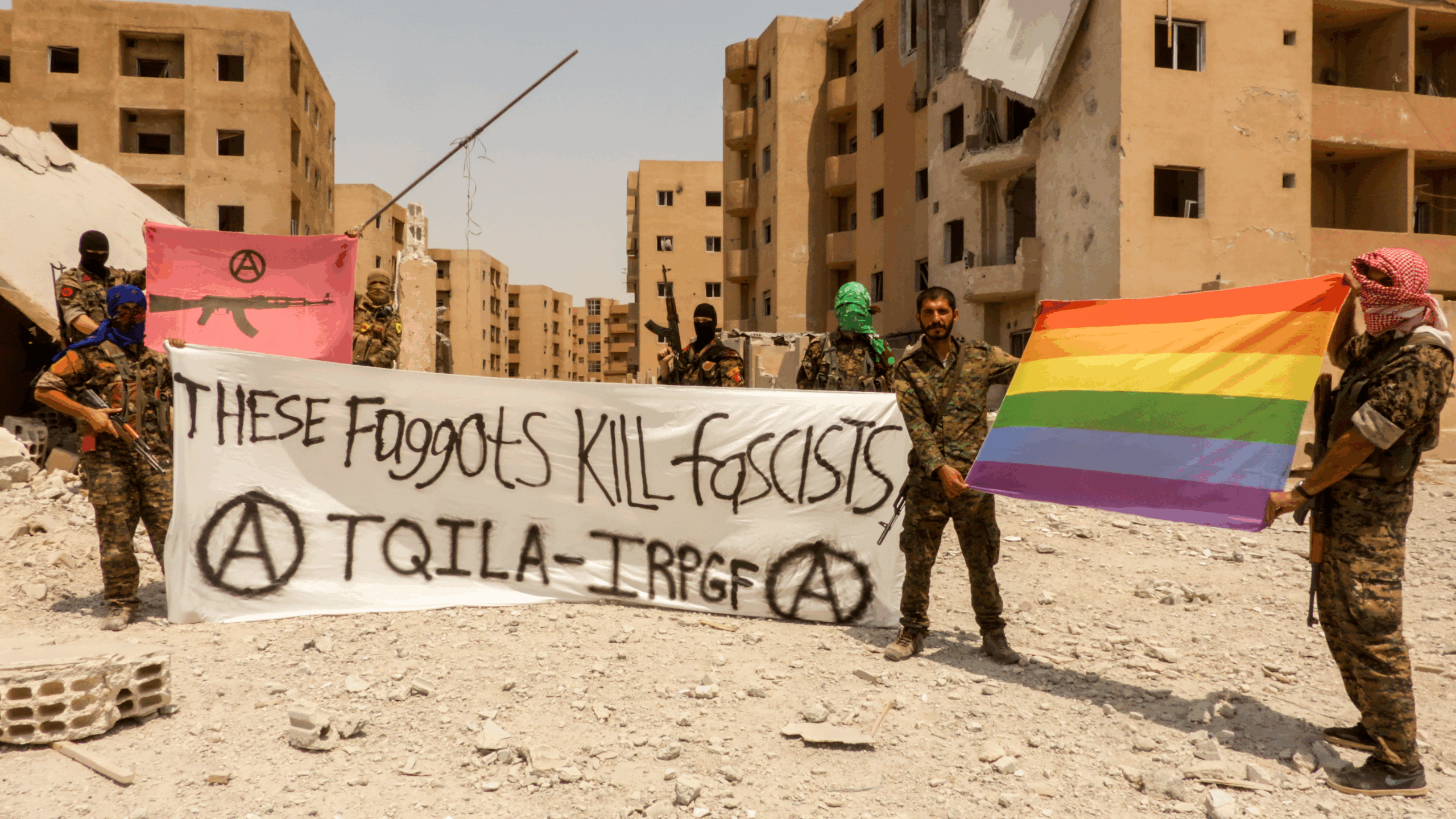 Fighters of The Queer Insurrection and Liberation Army, an armed international volunteer battalion posing in Raqqa after the liberation of the city in 2017. © IRPGF