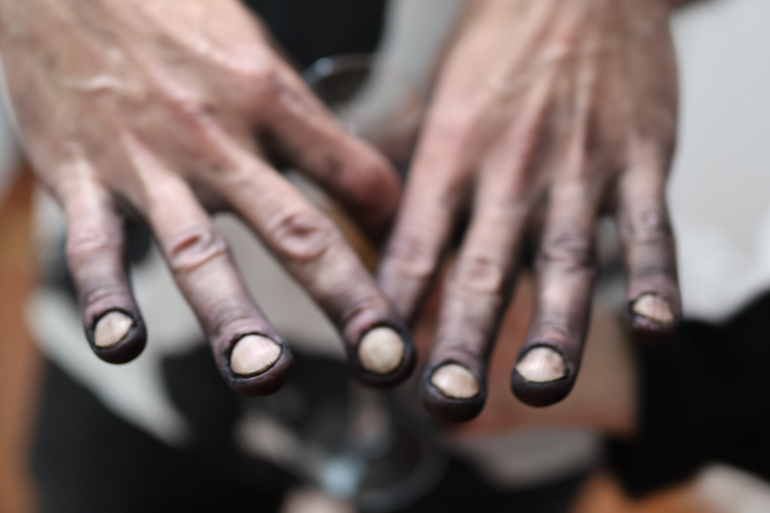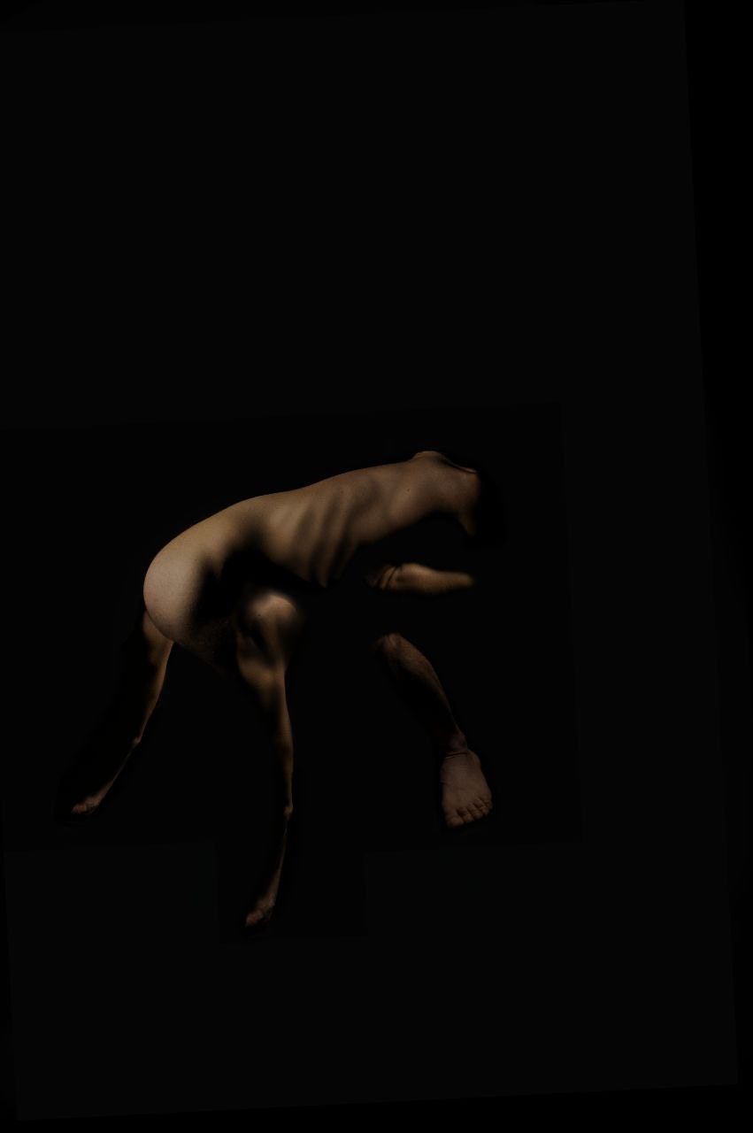 The third and final act, WASSATA_ an Arabic term that loosely translates to “mediation“- consisted of a silent dialogue between Sam Hrawy and Alicia Charrier. Both performers wore minimal skin-toned clothing to emphasize yet again the theme of vulnerability and exposure, as they negotiated their borders, both physical and emotional. They circled each other, ebbed and flowed, their movements ranging from fleeting tender touches to abrupt intentional collisions. Then, with black-ink-soaked hands, they crushed together against a long white triangle canvas, smearing and inscribing it with undecipherable notes of their encounter. The piece raises pressing questions about the volatility and complexity of human connection, put to the test of care and rejection, proximity and withdrawal.