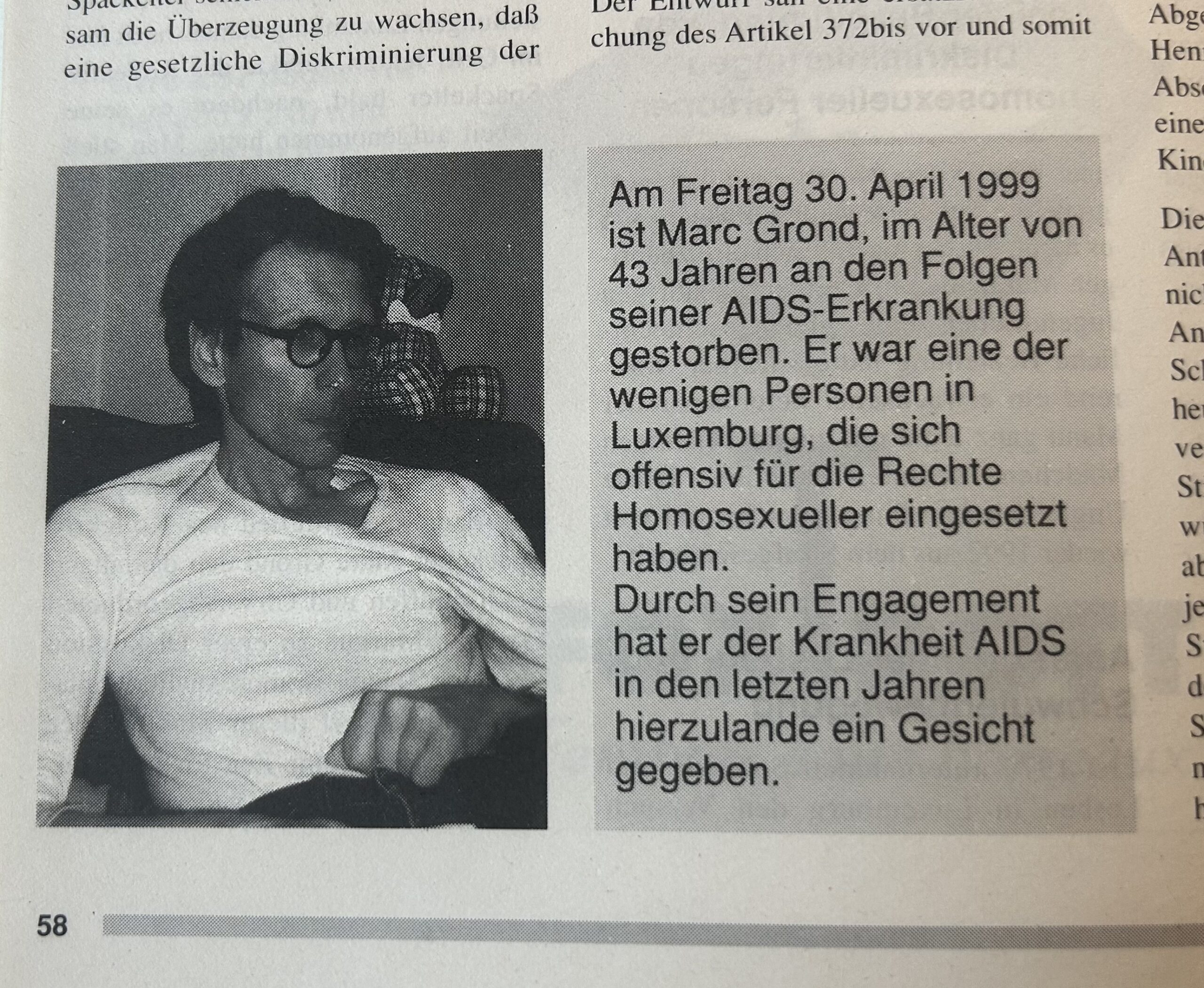 Marc Grond starb am 30. April 1999 mit nur 43 Jahren an den Folgen seiner AIDS-Erkrankung. Er war ein Aktivist mit Leib und Seele. Seine Kämpfe für die Rechte und Belange der Schwulen und Lesben hat er in den 80er und 90er Jahren leidenschaftlich ausgefochten. Dabei nutzte er alle möglichen Kanäle wie Fernsehen, Presse und Radio. Er hat sich nie vom heftigen Gegenwind aus den konservativen Reihen von Politik und Kirche entmutigen lassen. Im Gegenteil, man hat das Gefühl, er habe sich dadurch noch mehr für die Sache eingesetzt.