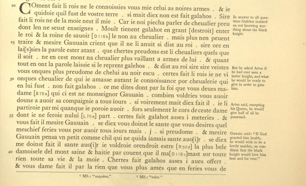 Le Cycle de la Vulgate est une épopée en plusieurs volumes qui retrace toute la saga de la cour du roi Arthur. Il s’y passe donc beaucoup de choses. Je n’en ai lu qu’une partie, mais je me suis juré qu’un jour, je m’y remettrais et le lirais en entier. Je vous suggère de trouver une meilleure version que celle que je possède, qui est en français médiéval, avec de courts résumés en anglais moderne dans les marges. C’est certainement une façon intéressante de découvrir la littérature. Si vous voulez l’essayer, les livres sont disponibles sur Internet Archive. La scène que nous avons utilisée comme illustration est tirée de The Vulgate Version of the Arthurian Romances, volume 3, page 253 (258 dans le document). Vous pouvez simplement passer à cet endroit.