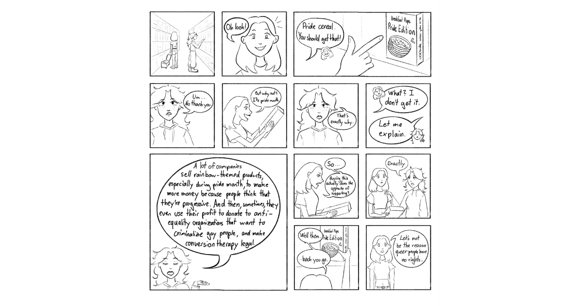 First published in Buchstawenzopp, the school paper of Lycée Ermesinde, Megan Maathuis’ Rainbow Comic explores everyday queer themes – comic strip by comic strip! This time, Maathuis’ protagonists go shopping during Pride season. So, should we buy the rainbow-colored cereal box or not?